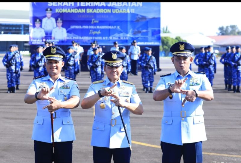 Makassar, Sulsel – Komandan Lanud Sultan Hasanuddin Marsma TNI Arifaini Nur Dwiyanto, M.Han., didampingi Ketua PIA Ardhya Garini Cabang 2/D.II Lanud Sultan Hasanuddin Ny. Betty Arifaini Nur Dwiyanto, menghadiri Serah Terima Jabatan (Sertijab) Komandan Skadron Udara 11 yang dilaksanakan di Apron Shelter Skadron Udara 11, Makassar, pada Jumat (27/3/2026).
