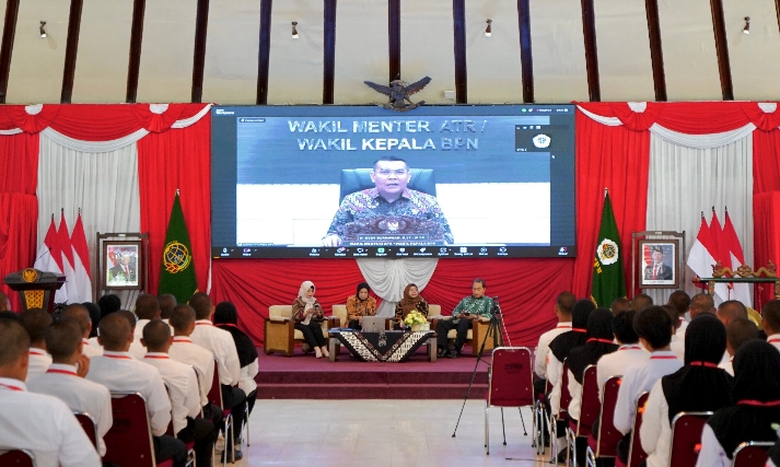 “STPN ini bukan sekadar proses menuntut ilmu, melainkan juga pembentukan karakter dan juga kepemimpinan, serta menjadi panggilan pengabdian kita kepada bangsa dan negara,” tutur Wamen ATR/Waka BPN secara daring kepada taruna baru STPN.