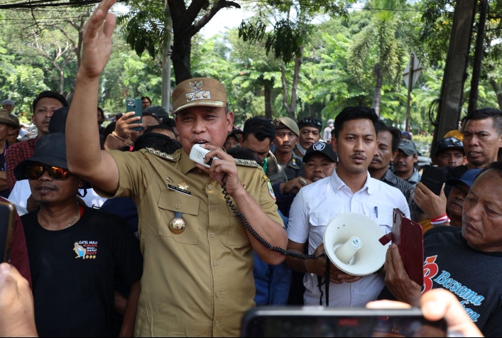 KOTA BEKASI, JABAR – Wali Kota Bekasi, Tri Adhianto bersama Wakil Wali Kota Bekasi, Abdul Harris Bobihoe, didampingi jajaran Forum Komunikasi Pimpinan Daerah (Forkopimda) Kota Bekasi dan beberapa perwakilan Anggota DPRD Kota Bekasi, temui langsung para peserta aksi unjuk rasa di depan kantor DPRD Kota Bekasi, pada Senin siang (1/9/2025).